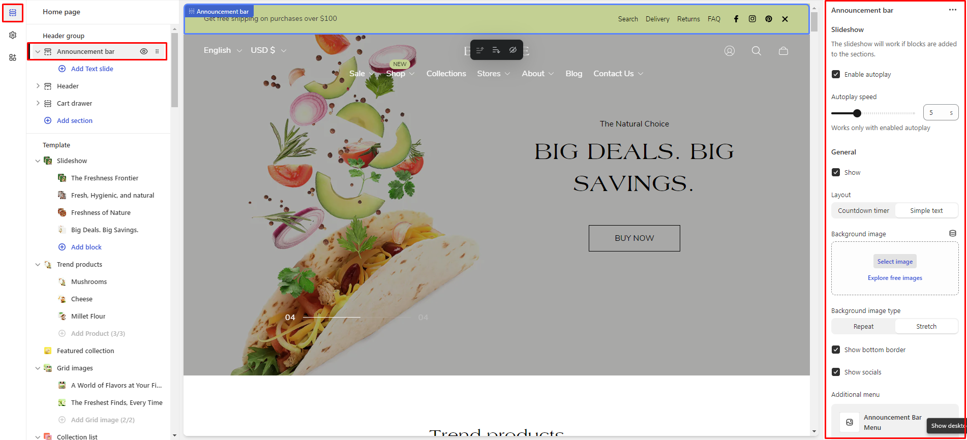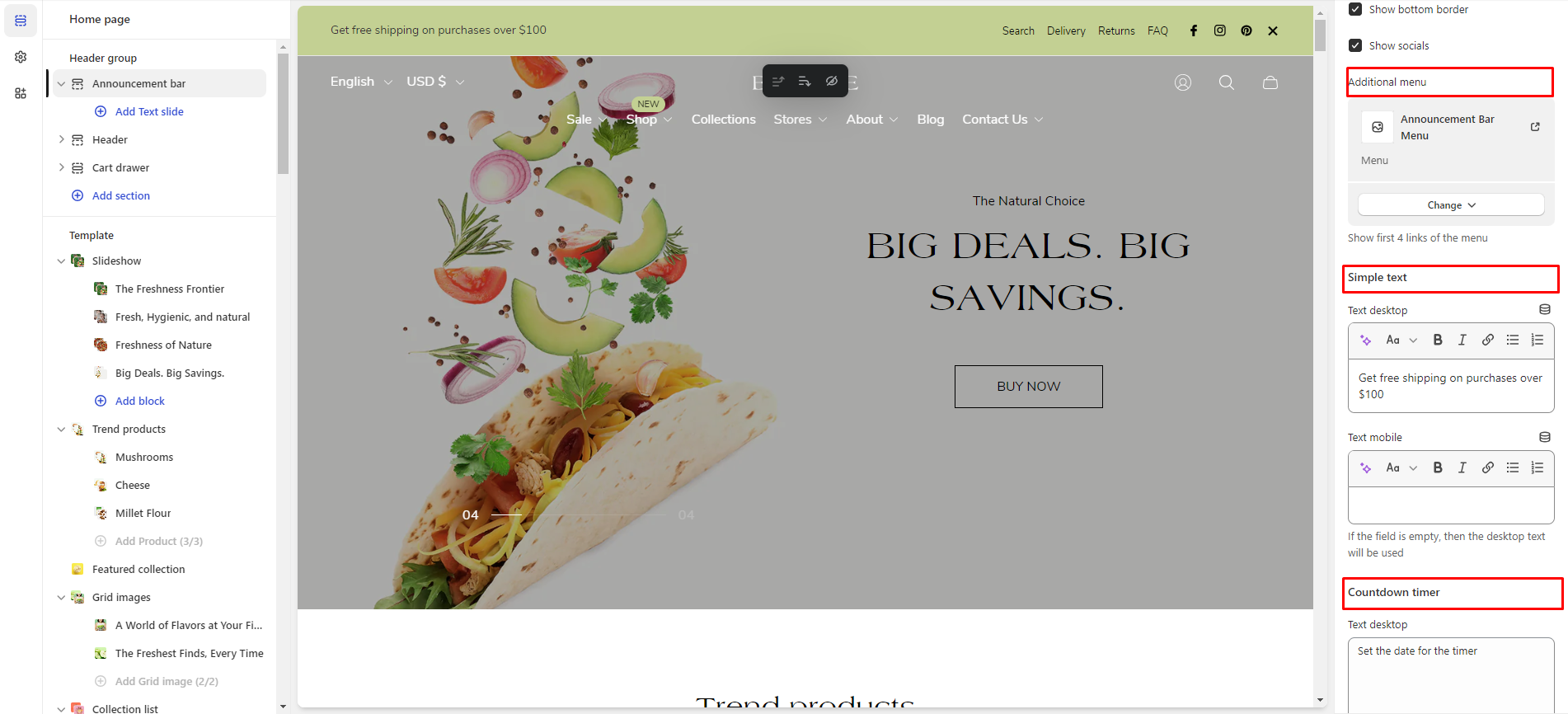 The Announcement Bar offers a variety of settings, including Simple Text, an Additional Menu, a Countdown Timer, and Color Options.